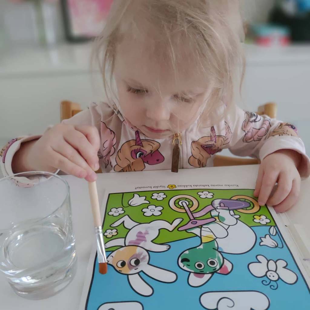 Vesimaalaus osoittautui toiseksi hitiksi. Se tuo tarkkuutta lasten kynänkäyttöön, samoin kuin pyyhittävät ensimmäiset kynäilyt. Näissäkin on tiettyjä tehtäviä ja askareita, mitä lasten pitää suorittaa. Meillä ei mennyt kovin kauaa, kun aikaisempien tehtävien tehtävänannot sulautuivat niihin tehtävänantoihin, mitä emme vielä ehtineet lapsillemme lukea tai selittää.